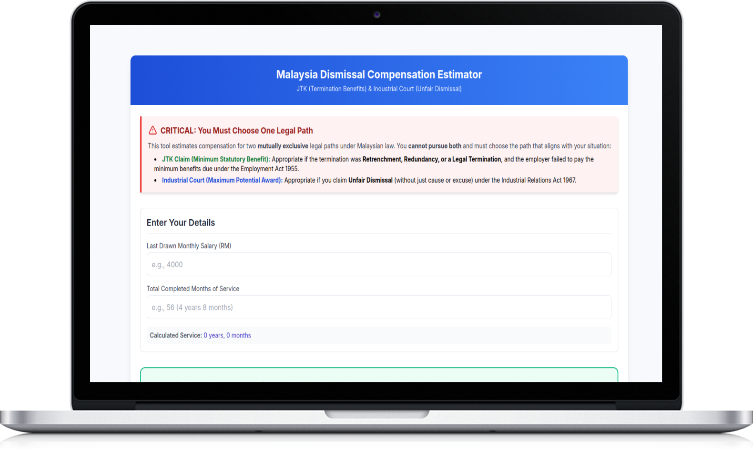 Calculate dismissal compensation in Malaysia instantly. This tool helps employees estimate termination benefits, unfair dismissal awards, and statutory entitlements under ...